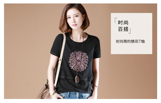 短袖;女;2018新款夏装;韩版;胖mm;大码;宽松上衣;刺绣;黑色;纯棉;T恤